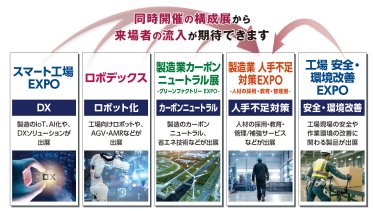 ファクトリーイノベーション Week は 製造の「DX」を実現する「スマート工場 EXPO」、「自動化」を実現する「ロボデックス」、「脱炭素」を実現する「製造業カーボンニュートラル展」、そして「人手不足対策」を支援する「製造業 人手不足対策 EXPO」に加えて新たに「安全・環境改善」に焦点をあてた「工場 安全・環境改善 EXPO」の5展にて構成されています。