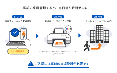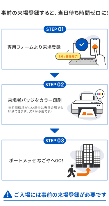 入場には必ず事前に来場登録が必要です。上部の「来場登録をする」よりご登録ください。